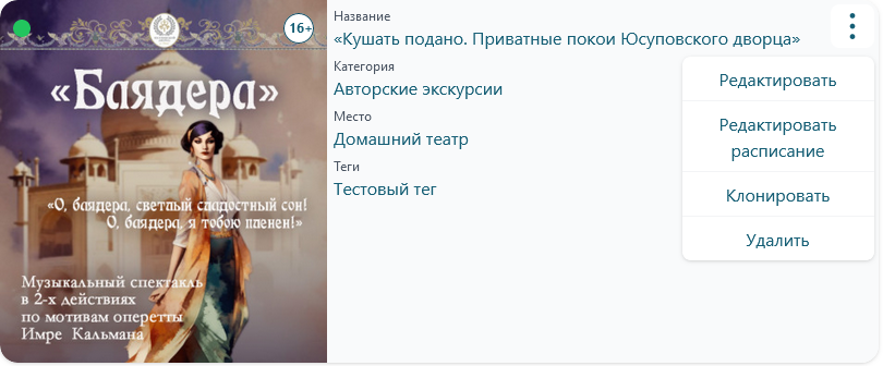Выпадающий список при нажатии на кнопку с тремя точками позволяет редактировать мероприятие, открыть страницу редактирования расписания, клонировать или удалить мероприятие. Переход на страницу редактирования также доступен при клике на картинку или название мероприятия.