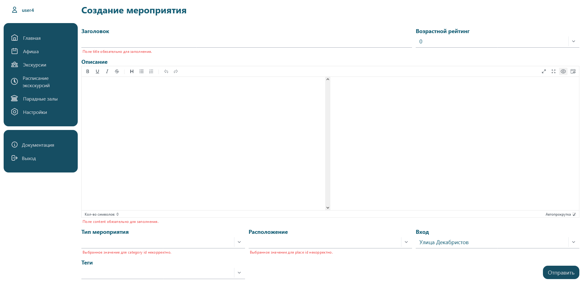 После нажатия на кнопку "Отправить" происходит проверка введенных данных. Если форма содержит недопустимые данные, под полем с ошибкой отображается красный текст, описывающий ошибку. Об успешном создании мероприятия сигнализирует всплывающее уведомление, затем открывается страница редактирования мероприятия.