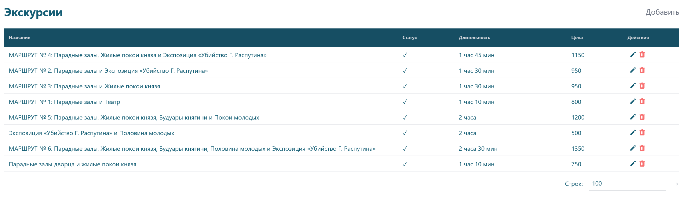 - Статус - отображаемые на сайте экскурсии помечены галочкой